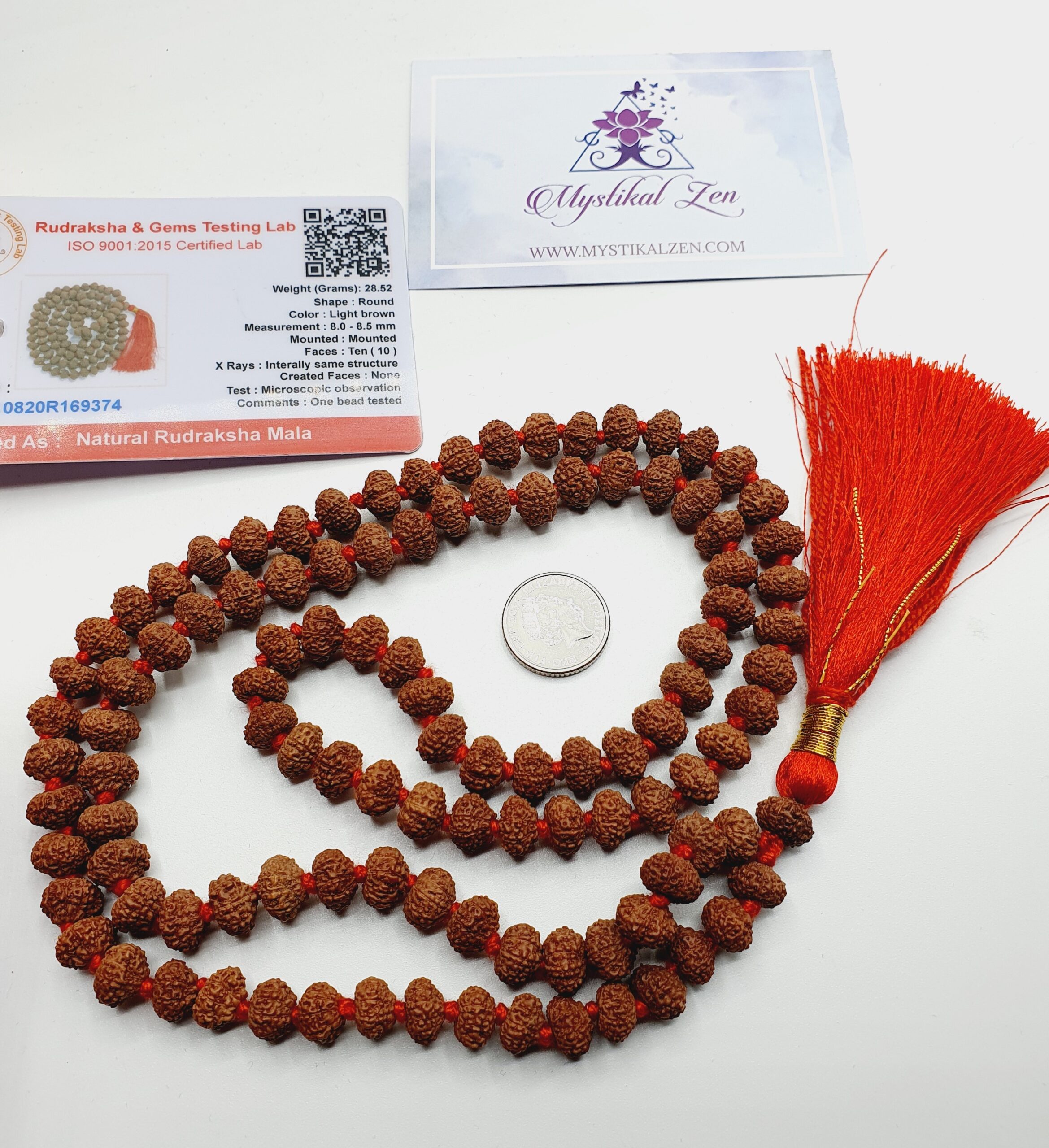 One Beautiful 10 Mukhi Rudraksha Mala with 108 beads with one Bindu, which allows for the flow of positive energy.