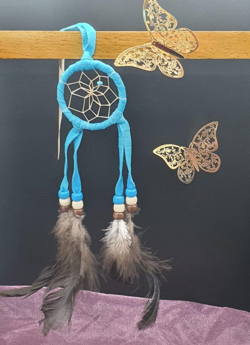 The Dream Catcher is to be hung by the window or at the head of the bed. Traditional Native American Indian beliefs hold that dreams come from outside ourselves. So the dream catcher acts like a spider web catching the good dreams for us to hold on to and help us during the day. Meanwhile the bad dreams pass into the hole in the centre where they are trapped and destroyed by the rays of the sun in the morning. The feathers symbolise air or the breath of life and carry our dreams to spirit.