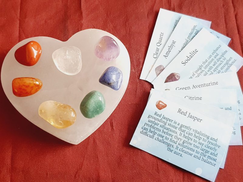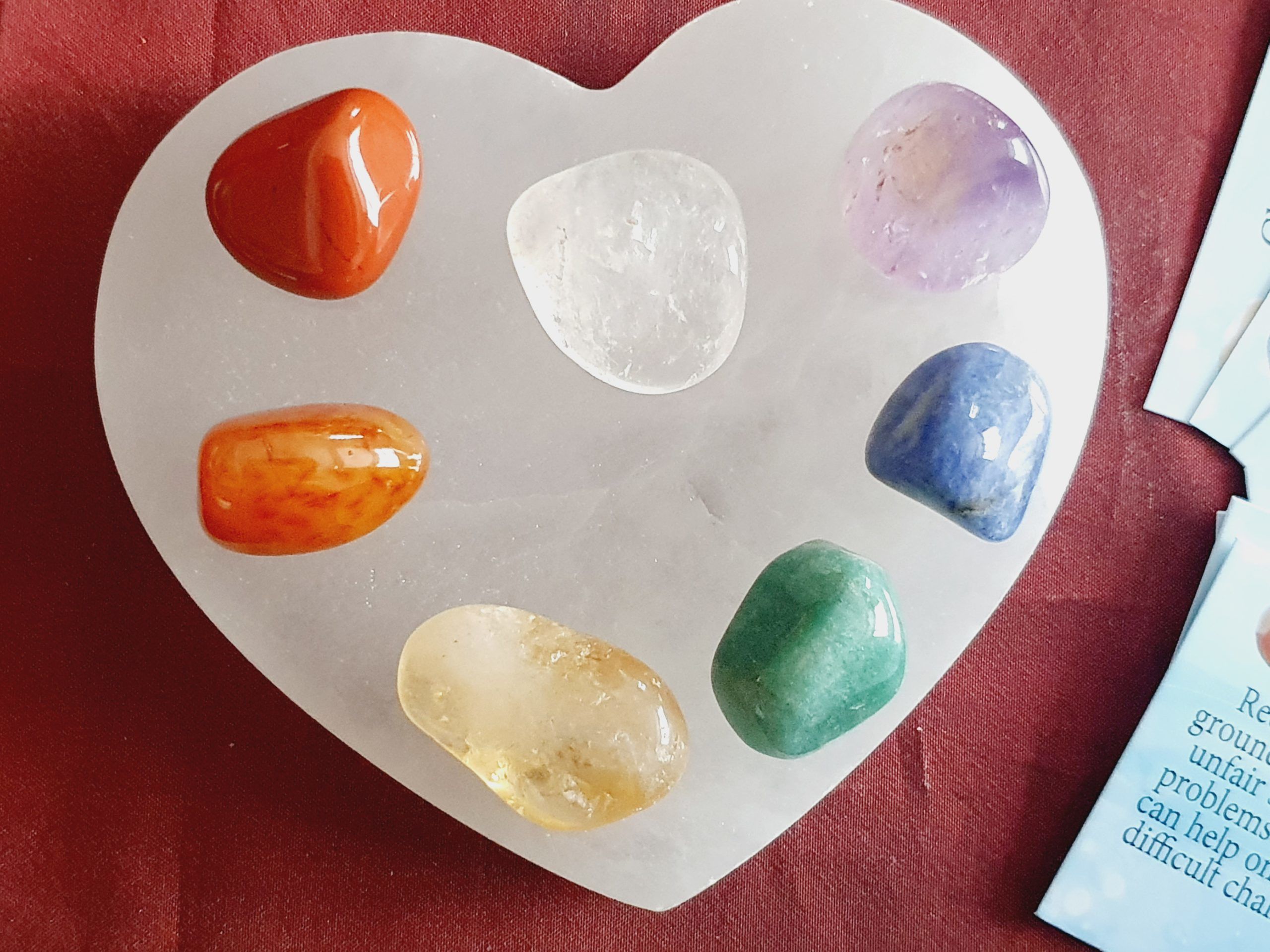 This kit comes with 7 tumblestones representing each of the 7 main Chakra /Energy Centers in our physical body and 1 x Selenite Heart Plate (11 x 10 x 1.8cm )