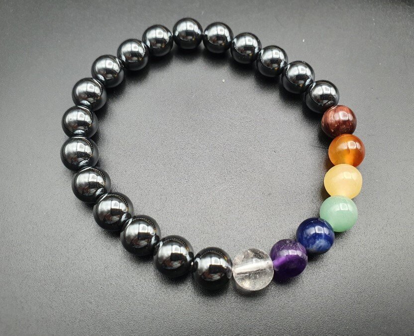 These popular Chakra bracelets come with 7 chakra and Hematite crystal 8mm beads which provide healing for the 7 energy centers in our body. They are strung together on stretchable plastic string. Each round bead is approx 8mm wide.