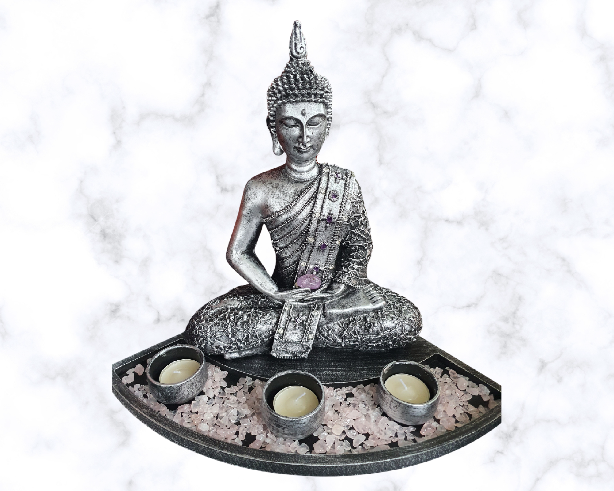 Option C – Buddha with plate, 3 tealights holders and 100g mix of healing crystals of your choice (Amethyst, Rose Quartz or Both Mixed). Please mark up on order which crystals chip you prefer. If you would like extra qty of chips please select from the drop down menu.