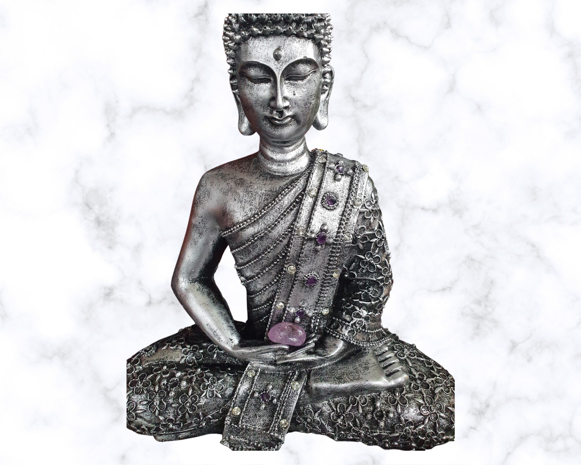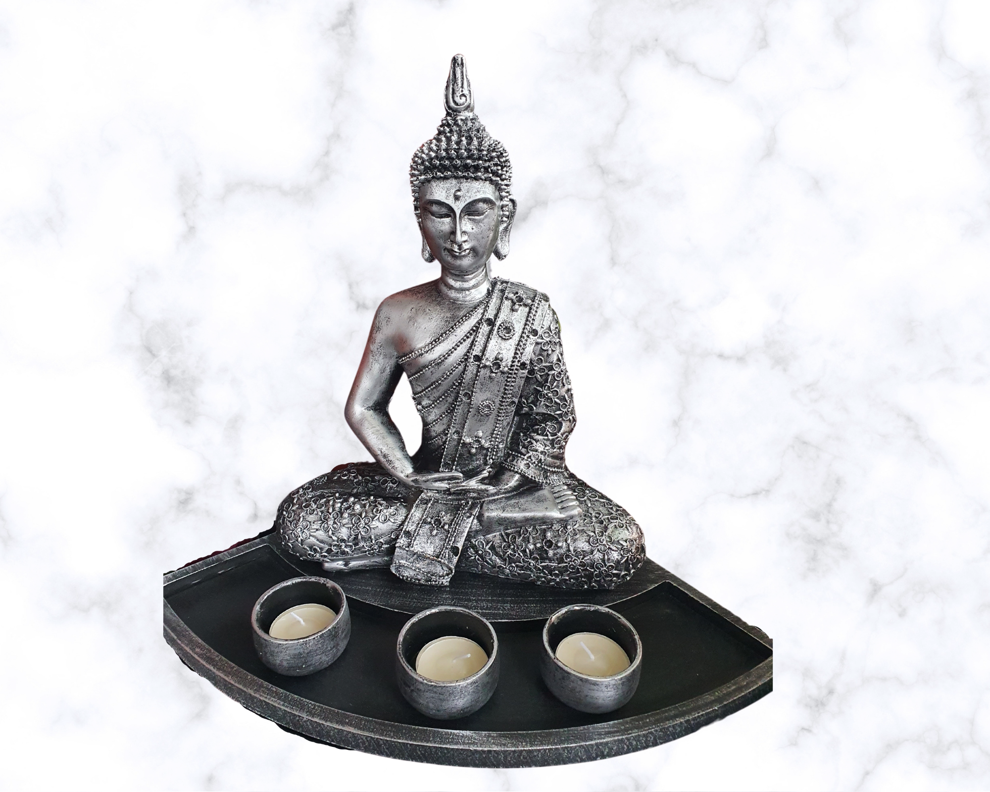 This beautiful Silver Buddha set comes with multiple options. All parts are moveable, which makes this set really interesting as you can use your own imagination to create a unique arrangement for you. Its light and elegant.