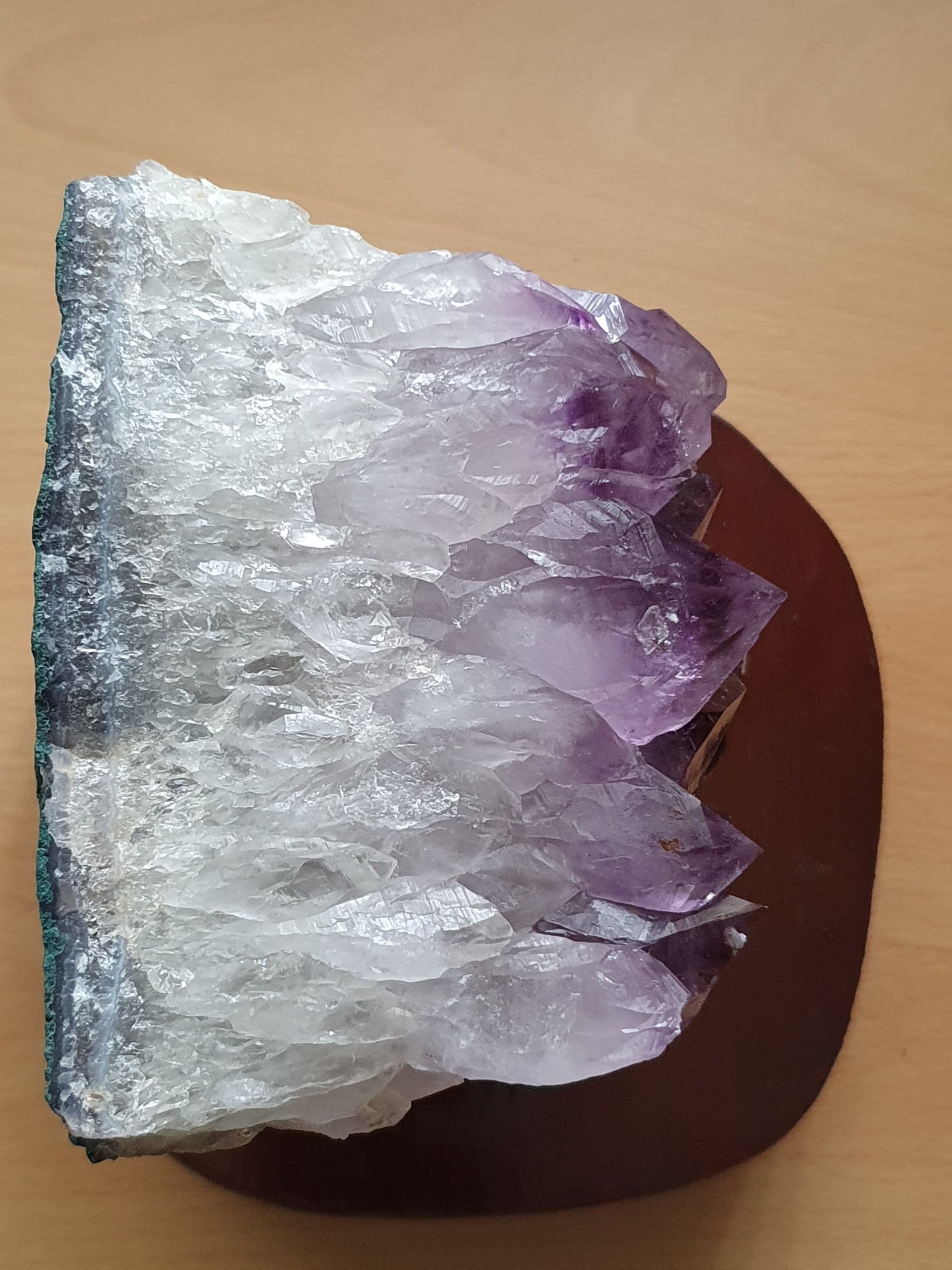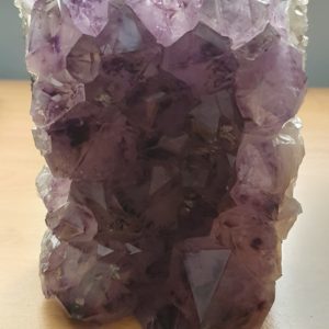 This particular Amethyst cluster contains beautiful goethite (black) and cacoxenite (golden brown) inclusions inside the Amethyst crystal as it has naturally formed over time.