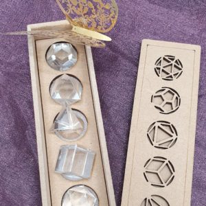 A great set of 5 Platonic shapes for use during meditation and deep healing work. Comes in an engraved wooden box.