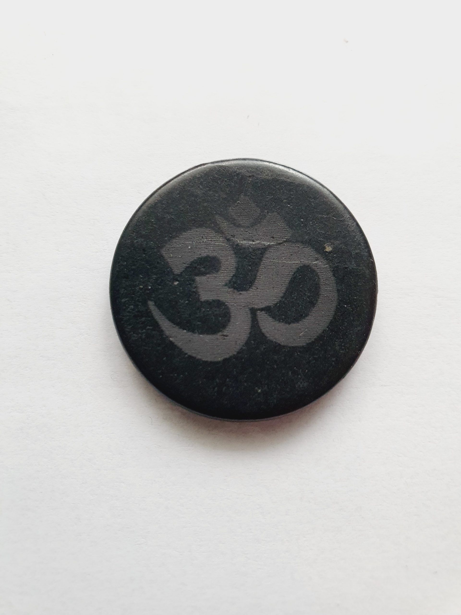 Shungite Round Disc Sticker with Ohm engraved on the top face, comes with peel able sticker on reverse. Made in Russia.