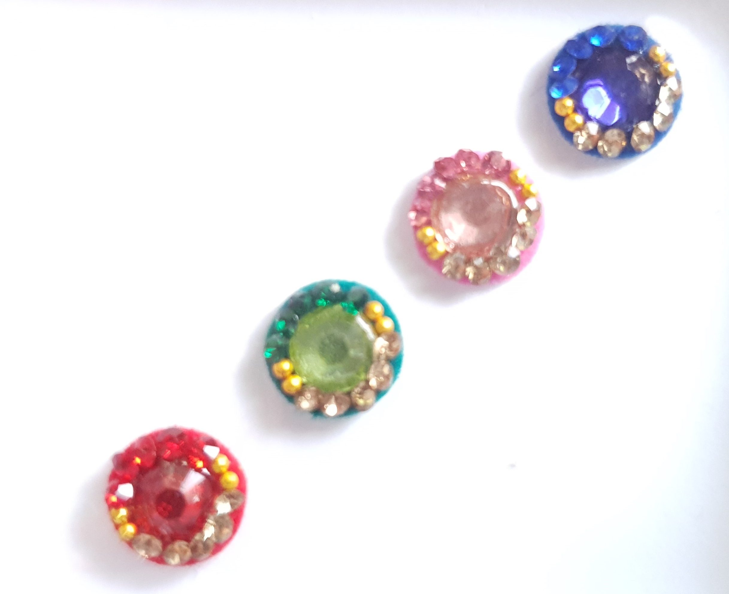 Our quality bindis are self adhesive and are ready to use. We recommend that after use, you put them back in its original packaging for extended wear and reuse. All bindis are delicate, so should be peeled gently out of the package to prevent any damage. Can be used as embellishments for crafts and scrapbooking too.