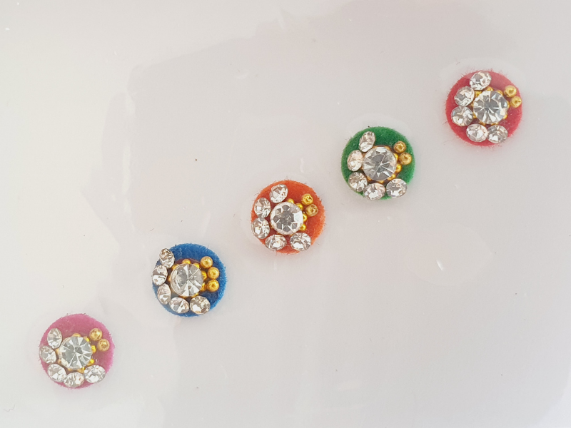 Our quality bindis are self adhesive and are ready to use. We recommend that after use, you put them back in its original packaging for extended wear and reuse. All bindis are delicate, so should be peeled gently out of the package to prevent any damage. Can be used as embellishments for crafts and scrapbooking too.
