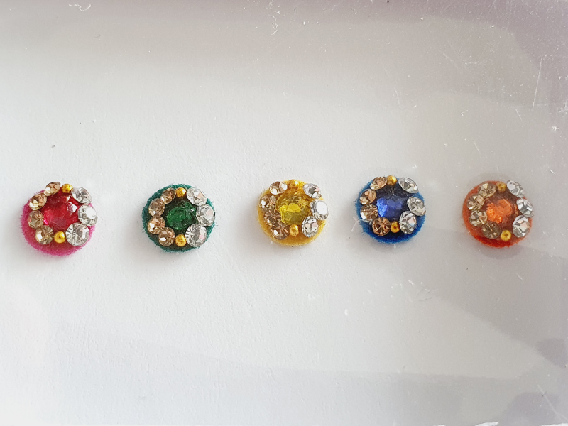 Our quality bindis are self adhesive and are ready to use. We recommend that after use, you put them back in its original packaging for extended wear and reuse. All bindis are delicate, so should be peeled gently out of the package to prevent any damage. Can be used as embellishments for crafts and scrapbooking too.