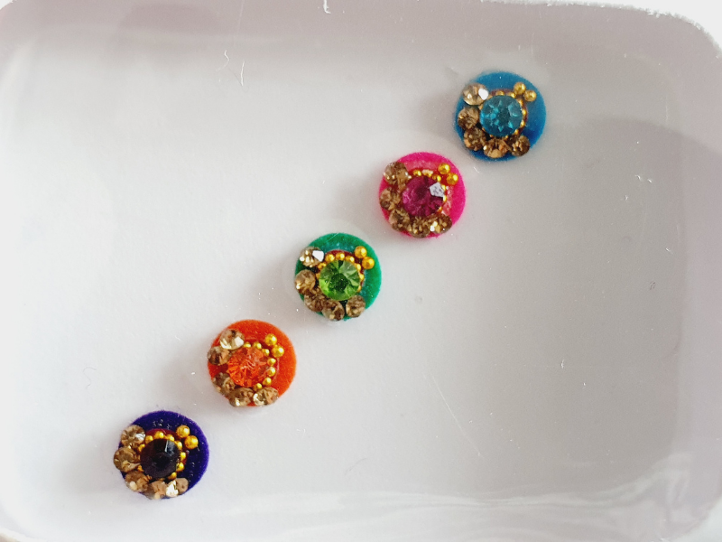 Our quality bindis are self adhesive and are ready to use. We recommend that after use, you put them back in its original packaging for extended wear and reuse. All bindis are delicate, so should be peeled gently out of the package to prevent any damage. Can be used as embellishments for crafts and scrapbooking too.